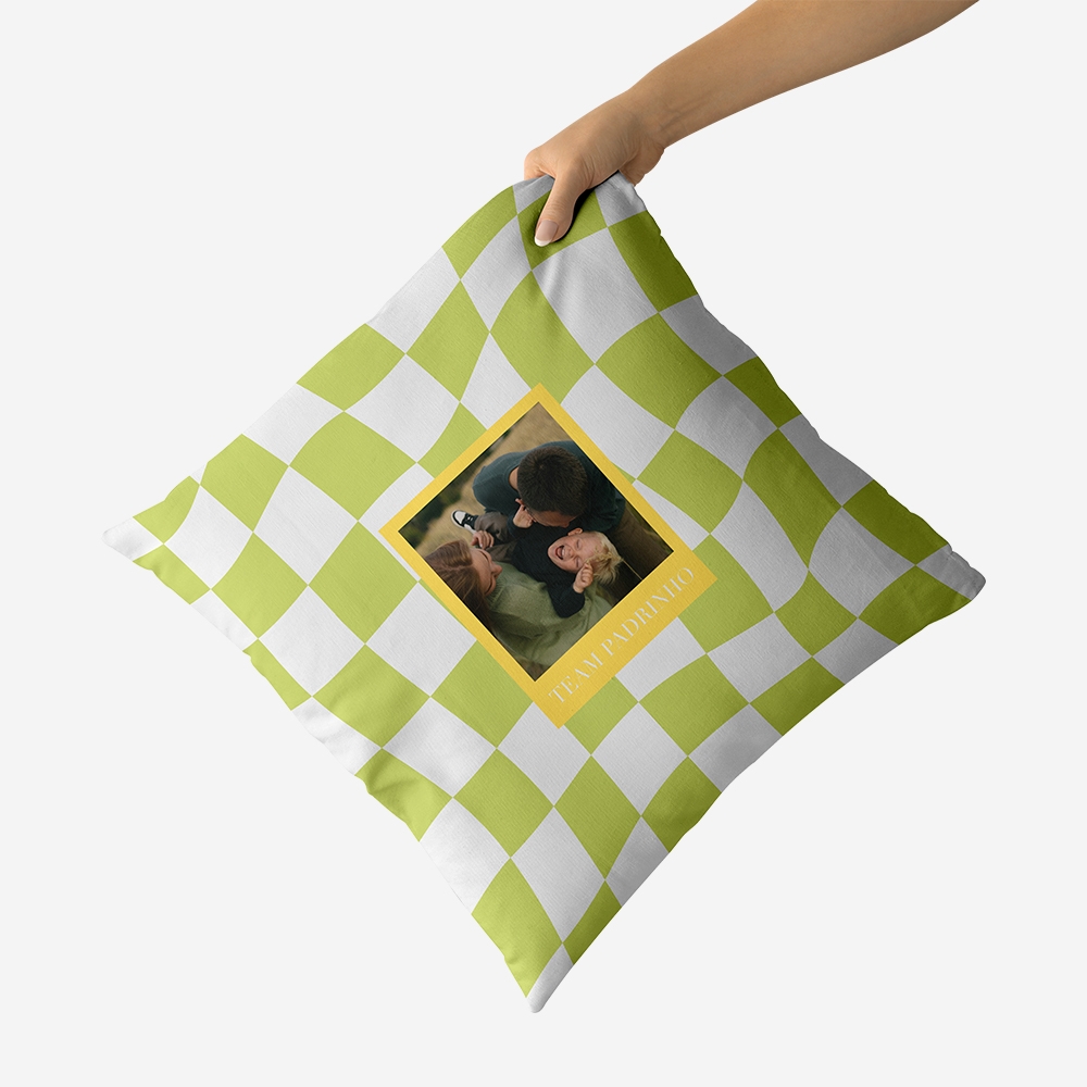 Dá um upgrade ao sofá com este padrão distorcido em verde azeitona. A moldura em amarelo faz a tua foto saltar à vista e transforma uma almofada simples numa peça com imensa pinta. Conforto e design moderno, sem complicações.